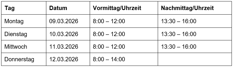 Montag, den 09.03. bis Donnerstag, den 12.03.2026