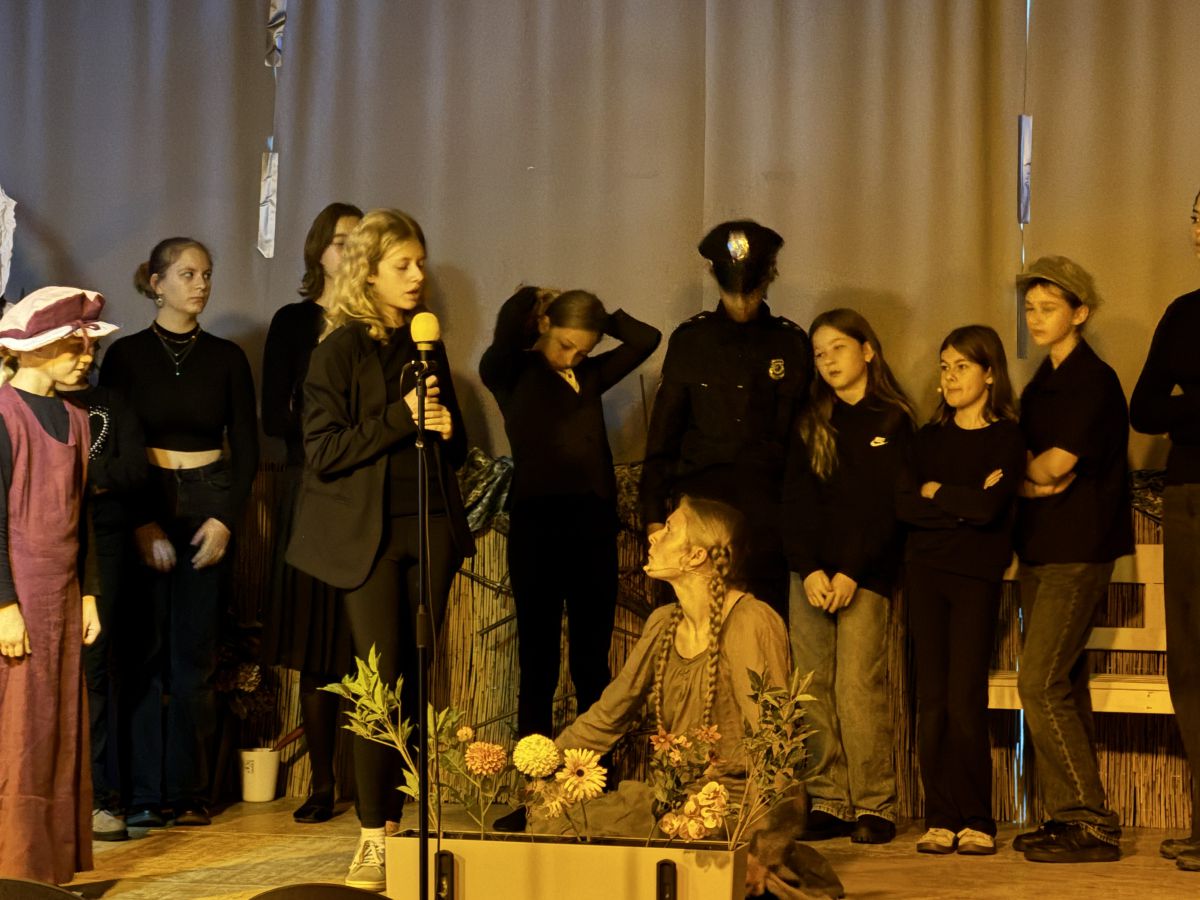 Im Backstage-Bereich der Aula des Edith-Stein-Gymnasiums herrscht während der Generalprobe gespannte Stille. Die Schülerinnen und Schüler stehen in kleinen Gruppen zusammen, manche flüstern sich noch die letzten Einsätze zu oder gehen ein letztes Mal ihren Text durch.